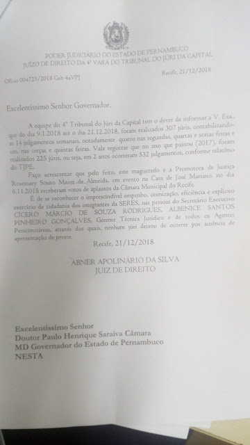 O SINDASP-PE recebeu o ofício do Magistrado Abner Apolinário da 4° Vara do Júri da Capital do Estado de Pernambuco, onde elogia os trabalhos dos agentes penitenciários por apresentação de presos e por 532 (quinhentos e trinta e dois) julgamentos realizados em 02 (dois) anos e todos realizados.