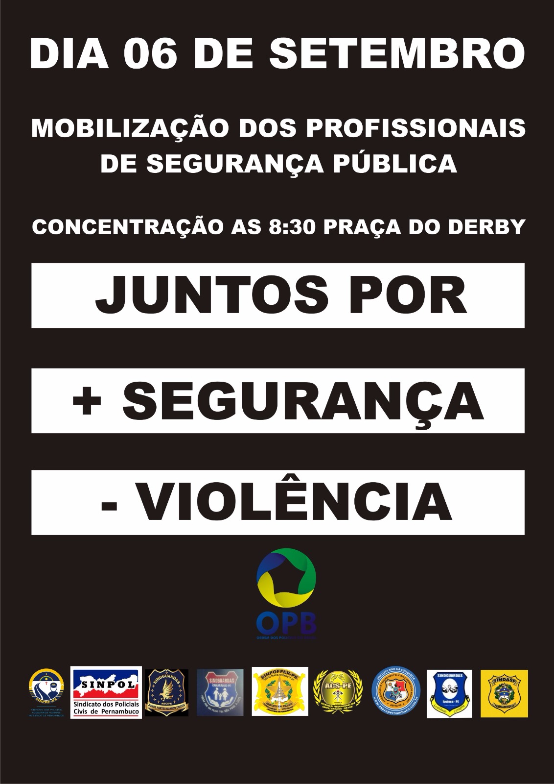 Os Agentes Penitenciários, Policiais Militares, Policiais Civis, Policiais Rodiviários Federais, Bombeiros, Policiais Ferroviários Federais e Guardas Municipais estarão no dia 6 de setembro se 2016, comconcentracao no Derby, às 08:30 h, realizando uma passeata em direção ao Palácio do Governo.