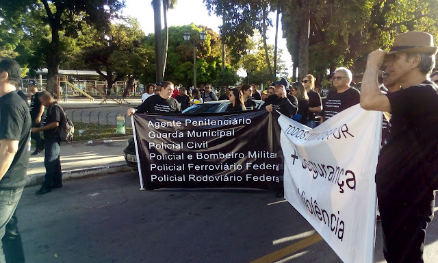 Profissionais da segurança pública realizaram, na tarde desta terça-feira (13), uma caminhada pedindo “Mais segurança e menos violência” pelas ruas da área central do Recife. Policiais civis, militares, rodoviários federais, ferroviários federais, guardas municipais e agentes penitenciários se concentram na Praça do Derby, terminando o ato no ao Palácio do Campo das Princesas, que fica no bairro de Santo Antônio.