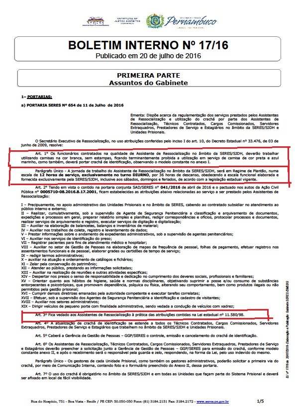 A Secretaria após negociação com o Sindicato regulamentou a Portaria que proíbe o uso de camisa preta e azul marinho, bem como determina que estes contratados usem crachás. Inclusive foi acordado e regulamentado que os Assistentes de Ressocialização irão trabalhar em horário exclusivamente diurno.