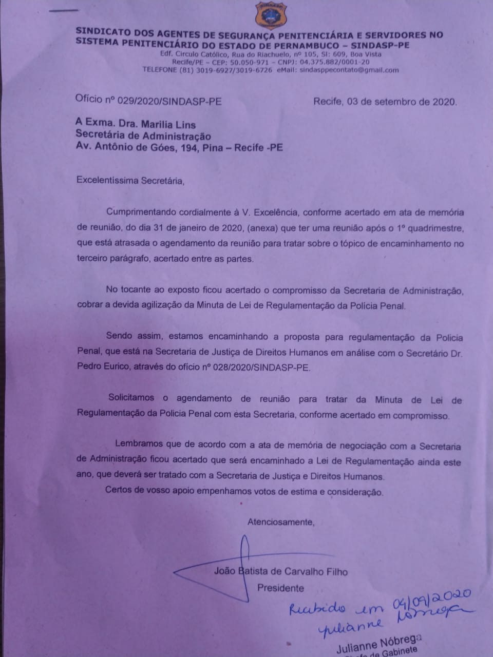 Lembramos que a Minuta de Lei de Regulamentação foi devidamente aprovada em Assembleia Geral da Categoria no início do ano de 2020. Com isso encaminhamos a proposta de Minuta de Lei de Regulamentação da Polícia Penal para tratativas desde janeiro de 2020, e ratificamos novamente para a discussão final após a Promulgação da Emenda Constitucional Estadual nº 53/2020, conforme documentos abaixo: