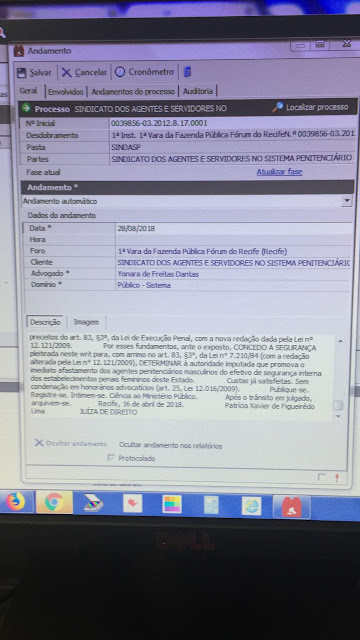 O SINDASP PE em 2012, na Presidência de Nivaldo, entrou com ação em cumprimento a previsão legal, tanto da lei federal n ° 12.121/2009 , que determina que unidades femininas só podem trabalhar na parte internas as agentes penitenciárias femininas.