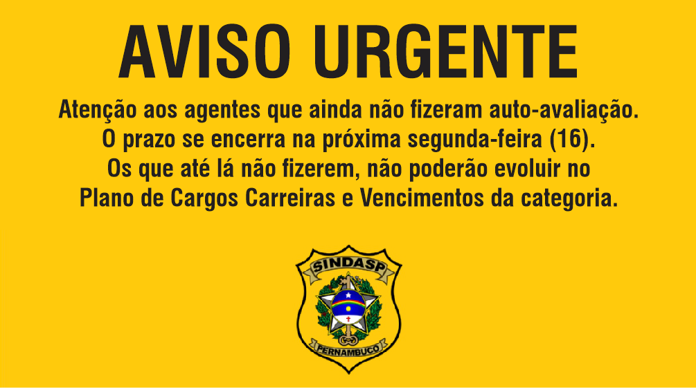 Atenção aos agentes abaixo que ainda não fizeram auto-avaliação. O prazo se encerra na próxima segunda-feira (16). Os que até lá não fizerem, não poderão evoluir no Plano de Cargos Carreiras e Vencimentos da categoria.